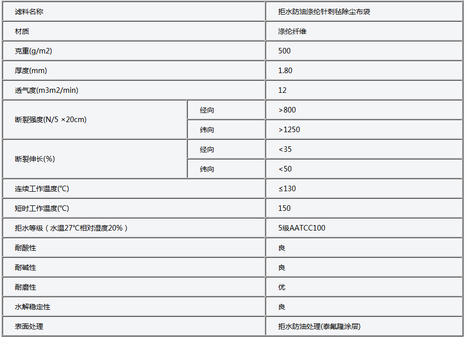 拒水防油針刺氈除塵布袋產品特點: